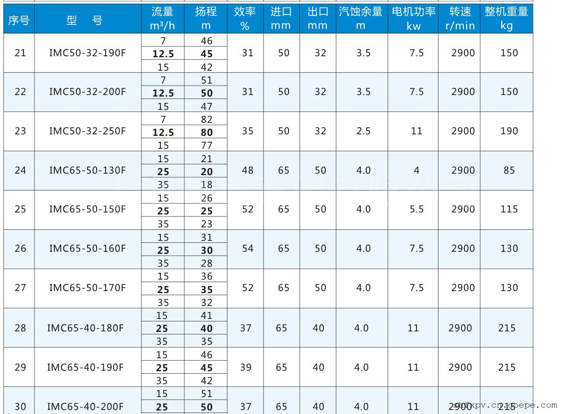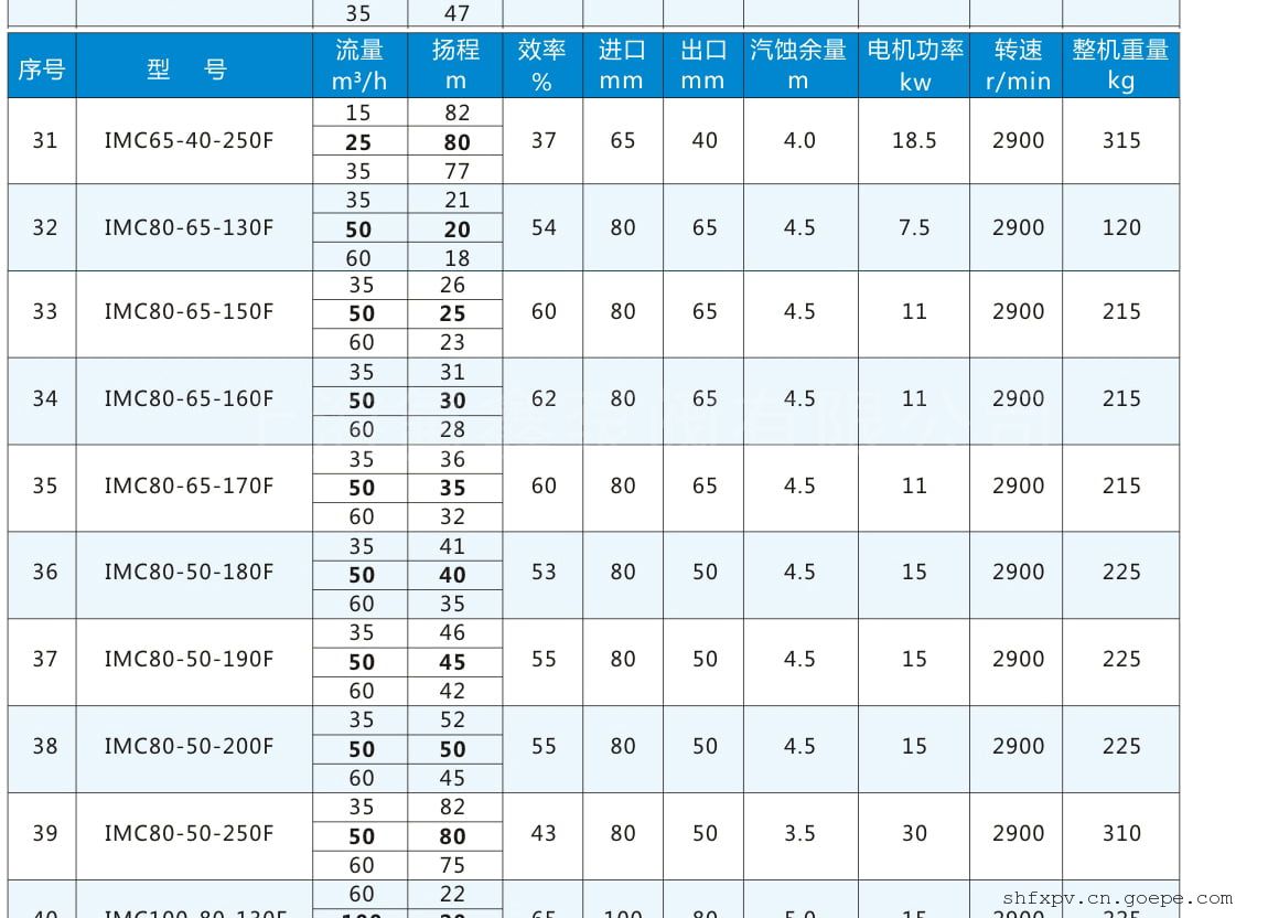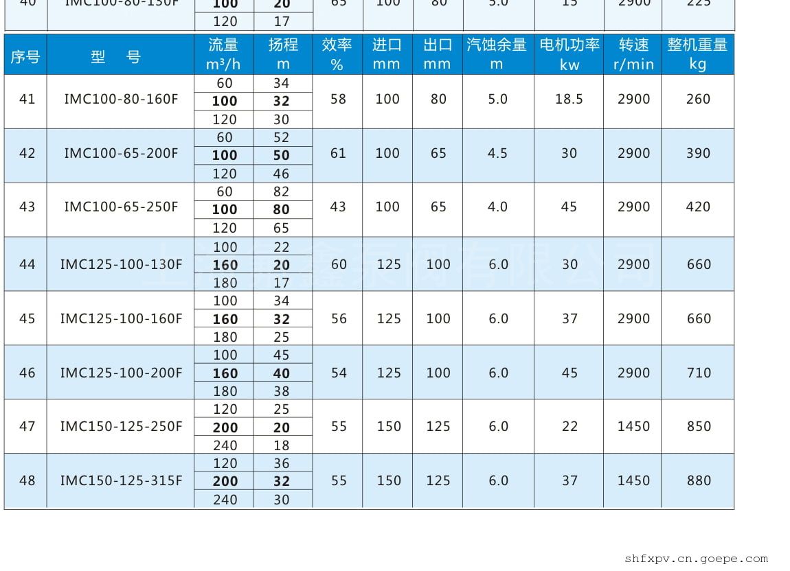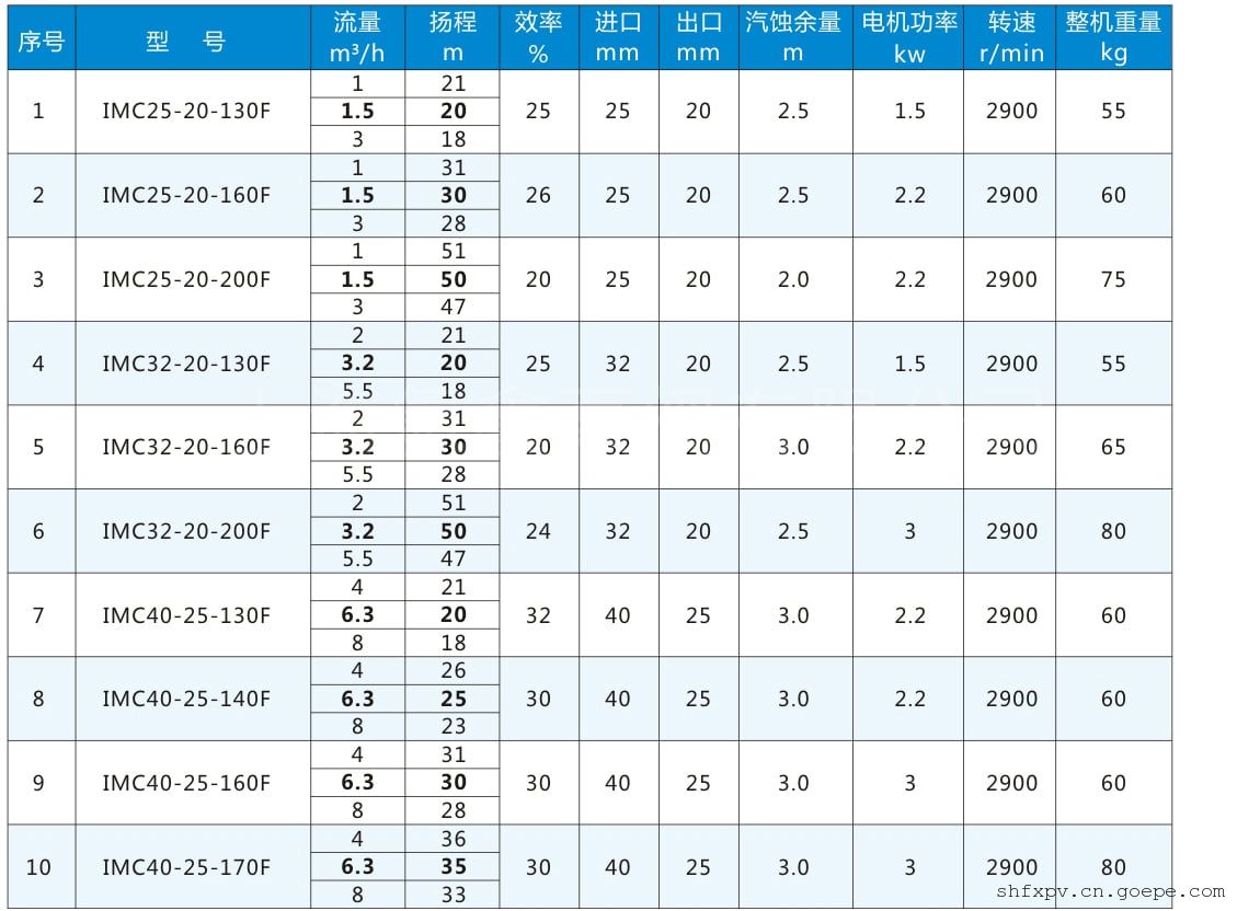 IMC:磁力驱动泵代号丨 80:进口直径80mm 丨65:出口直径65mm 丨160:叶轮名义直径160mm丨F:过流材质为氟塑料合金性能参数表:电机转速2900r/min,表中流量扬程加粗为额定参数